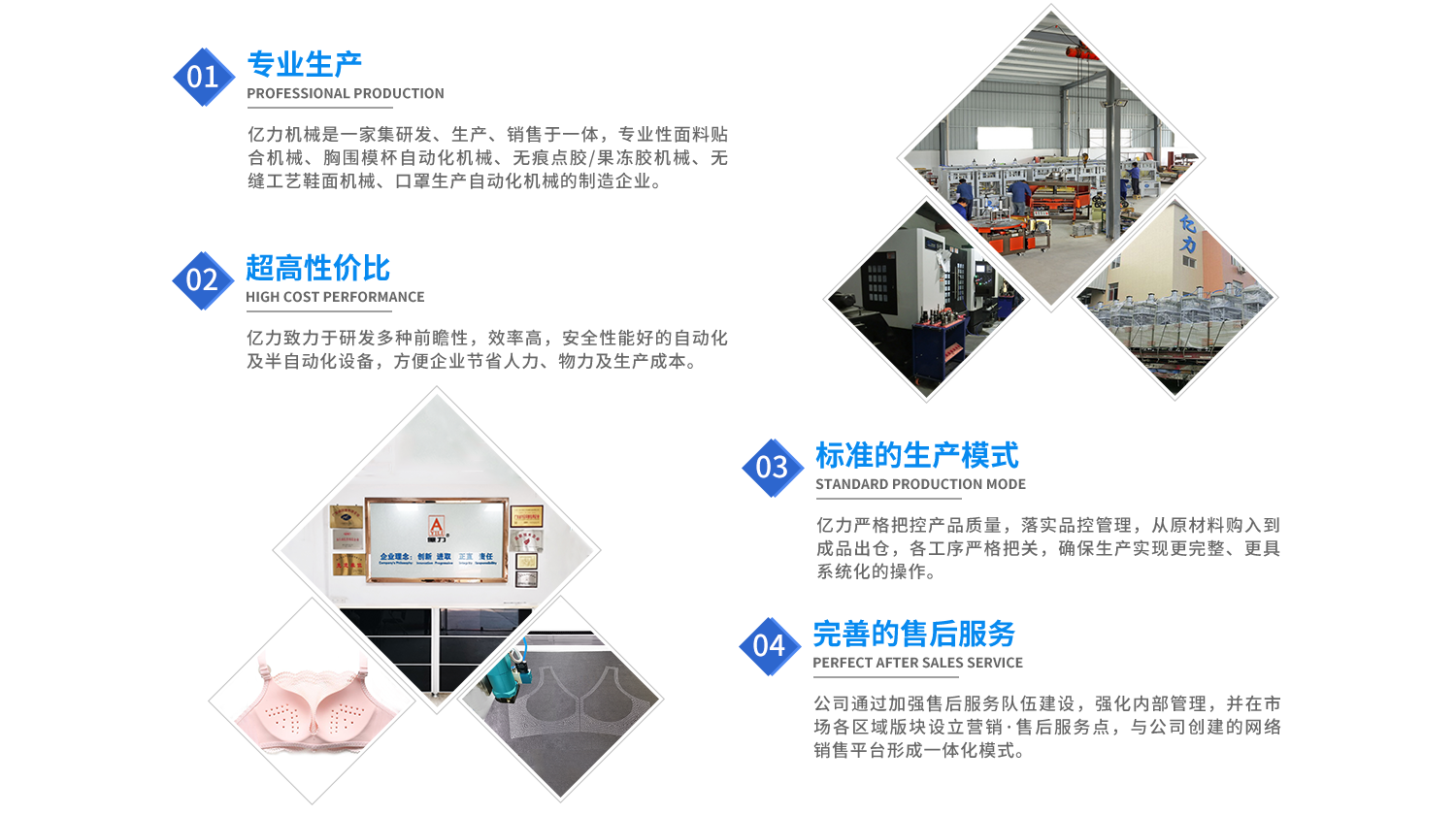 汕頭市億力機(jī)械設(shè)備有限公司網(wǎng)站正式上線(xiàn)! 汕頭市億力機(jī)械設(shè)備有限公司是一家集研發(fā)、生產(chǎn)銷(xiāo)售于一體的專(zhuān)業(yè)性面料貼合機(jī)械、胸圍模杯機(jī)械、無(wú)縫工藝鞋面機(jī)械、口罩生產(chǎn)線(xiàn)和焊耳帶機(jī)械企業(yè)。